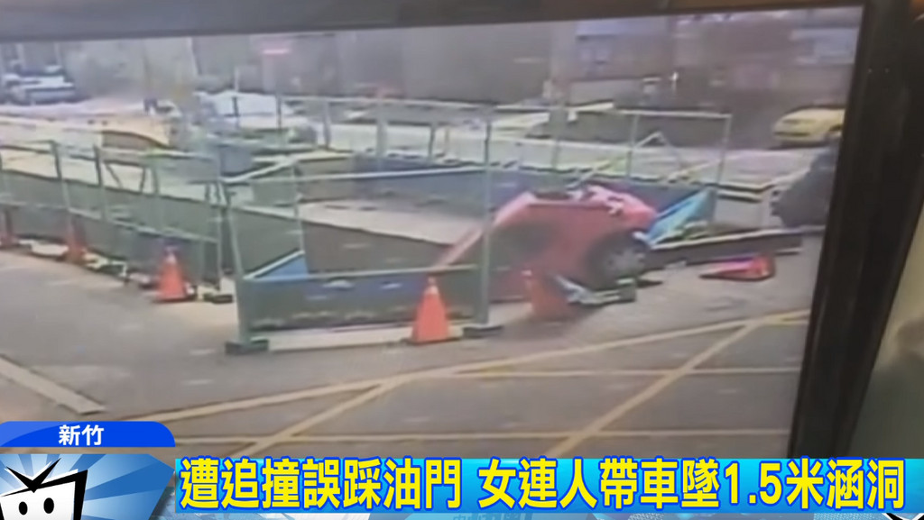 新竹一名賴姓女子,22日中午開車行經中興路四段往竹東方向,突然遭後方鄧姓男子駕駛的貨車追撞,原本只是輕微搖晃,不過賴女疑似受驚嚇太過緊張而誤踩油門,導致整輛車撞破一旁工程圍籬,連人帶車衝進1.5公尺的涵洞中。