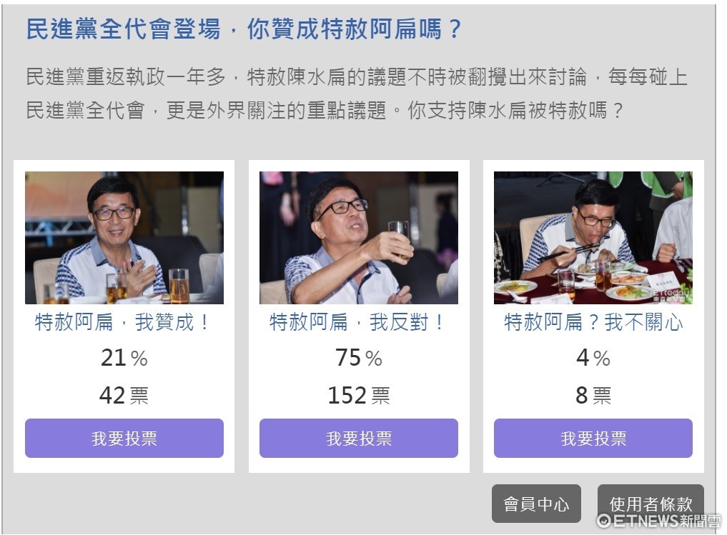 ▲《ETNEWS新聞雲》「民進黨全代會登場,你贊成特赦阿扁嗎?」民調投票,即時投票狀況。