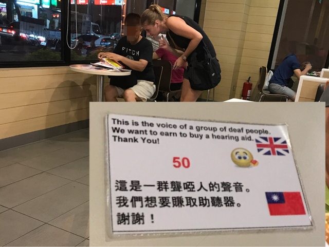 高雄市區近日出現一名金髮洋妞,在各大連鎖餐廳、車站與風景區都有她的身影,拿著一張護貝紙板比手勢,向路邊的民眾籌措50元,用途是購買助聽器。網友陸續發文討論此行為,引起熱烈討論。