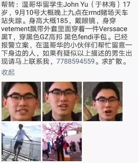 于林海自9月11日開始失聯,警方直到22日才在列治文市路段(River Rd.)、菲沙河邊(Fraser River)發現他的屍體。據了解,于林海10日晚間與一名同校的女同學搭車返家,但卻突然提前在列市橋港站(Bridgeport Station)下車,之後便再無音訊。