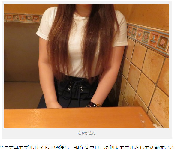 曾經隸屬模特兒網站,現在以個人模特兒身分自由接案的沙也佳(化名)今年29歲,有著一頭棕色長髮與柔軟豐滿的E奶身材。根據《日刊SPA!》的採訪,有過酒店、風俗店經驗的沙也佳表示,當初會進入外拍模特兒行業的契機是透過約會網站的一個邀約,5年前為了賺點零用錢而註冊了約會網站,反而被模特兒網站發掘進而邀請她加入,因為缺錢就順其自然地接受了。