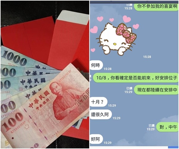沒想到,友人過了半小時回她「我只參加朋友的婚禮,我的禮金是辛苦賺的,不亂包給陌生人,我結婚的時候也好多位朋友沒到,我也沒指責任何人,反正我朋友多,幾個沒來,也不會影響婚禮的進行。」女網友心想可能是之前與對方交易,延遲出貨引起對方不滿,但她也不太確定,但仍氣得上網公評。