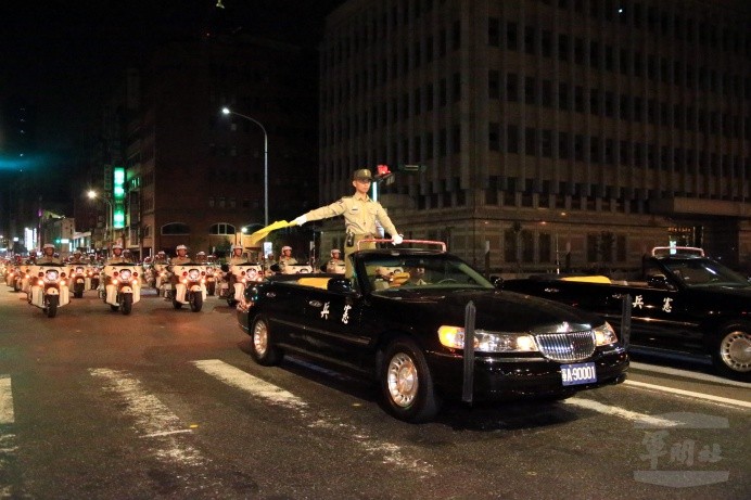 憲兵指揮部勤務連警衛排於凌晨12時30分起在總統府前進行連續3個多小時的訓練,以56輛重型機車的方陣隊型通過總統府前,儘管夜已深沉,所有參演官兵仍精神抖擻、士氣高昂,一次次跟著幹部的導引,認真練習隊形、速度、距離,甚至是車子的操控度,力求整齊劃一,為國慶大會完美演出做好準備。