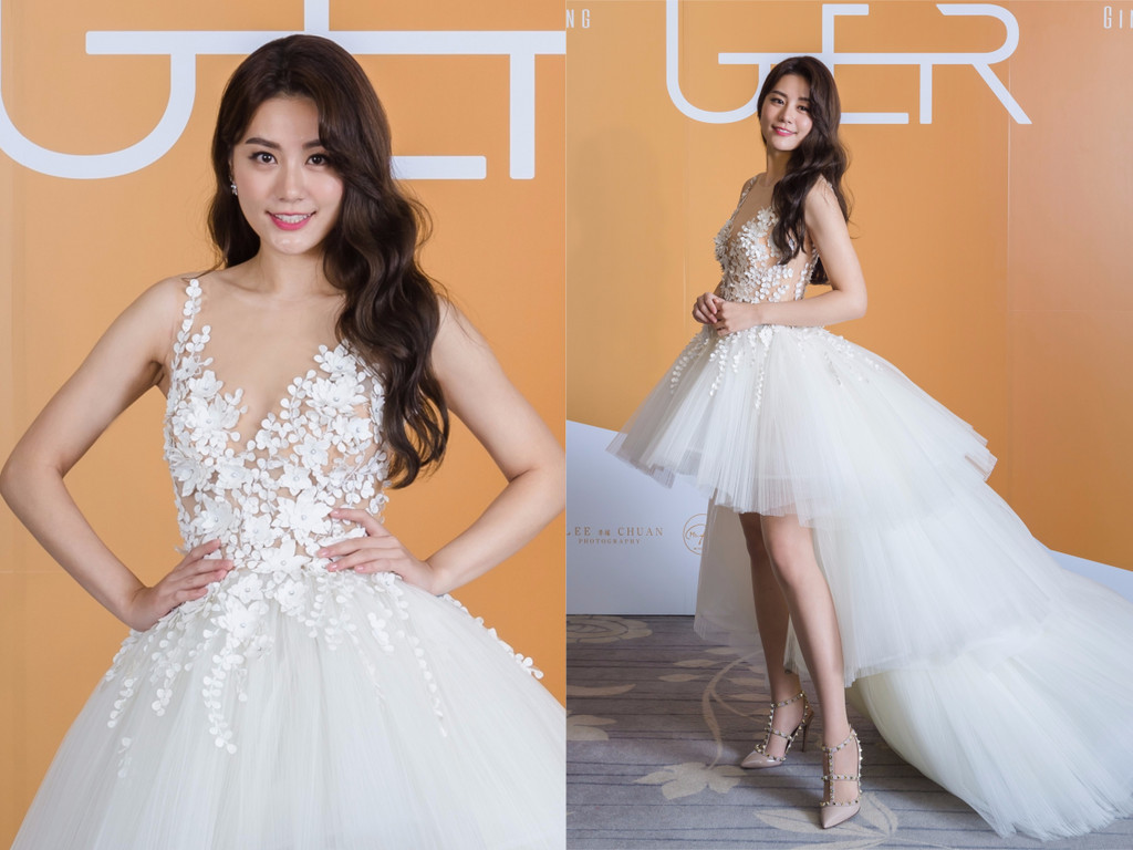 ▲小蠻穿著前短後長的婚紗,秀出美腿。