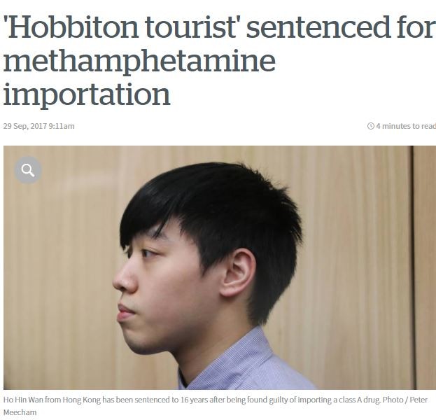 24歲香港青年因2016年運送近20公斤、市值約6800萬港元(約台幣2.6億)的冰毒到紐西蘭,29日在當地法院被判囚16年半。他向當地警方聲稱,自己是為了「籌集資金」來台唸書才會這樣做,以為包裹內的只是「運動鞋」,不知道其實是毒品。