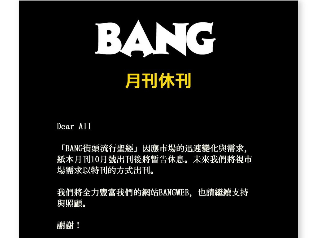 《BANG》創立於1998年,以潮流時尚內容為主,最後一期10月號封面是「五月天阿信與羅志祥」,剛好是兩人潮牌聯名的新聞。不少年輕人從《BANG》,開始接觸潮牌與時尚,可說是入門必看刊物。