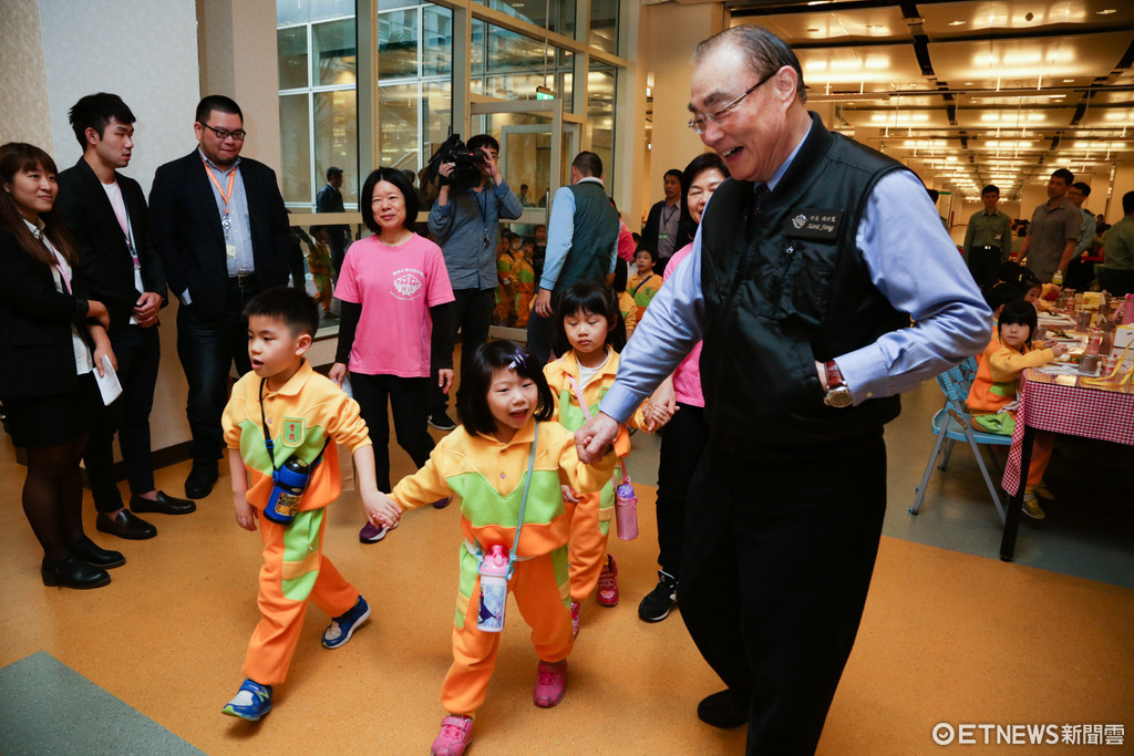 ▲公立幼兒園希望達到跟私立4:6的比例。(圖為國防部長馮世寬與幼兒園兒童餐敘/記者林世文攝)