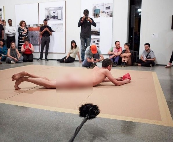 ▲巴西藝術家赤裸躺在地上,邀請觀眾隨便觸碰他,引起爭議。(圖/翻攝自atravestv IG)