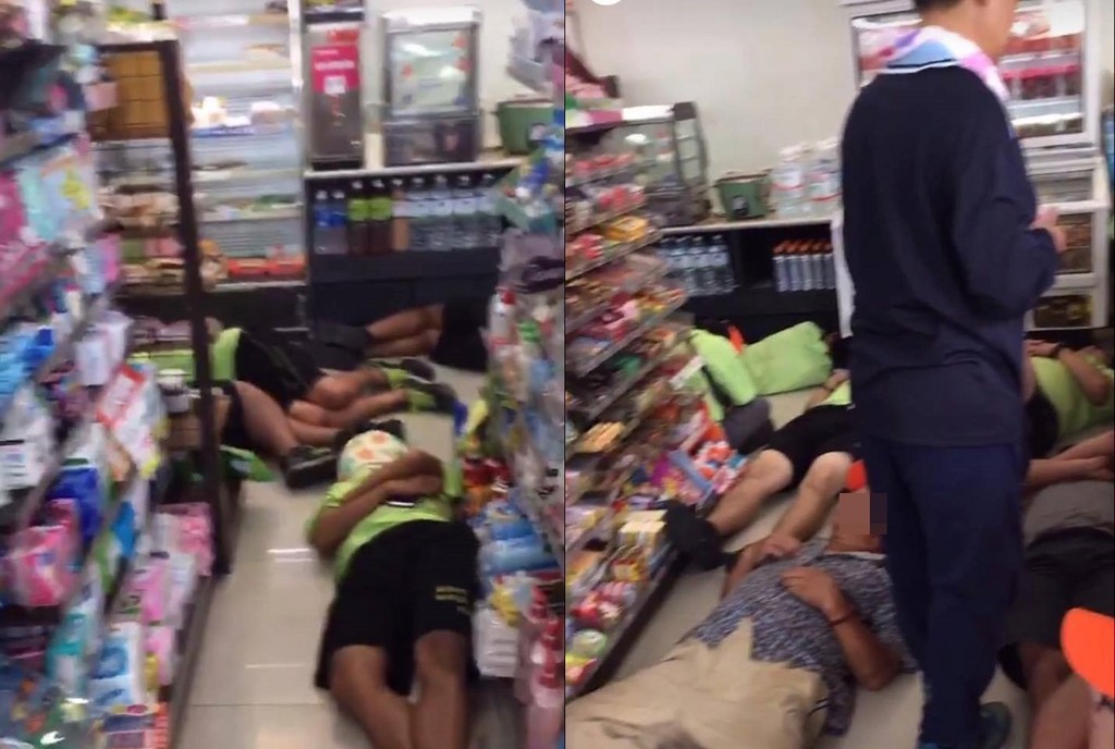 網友於「爆料公社」發文表示,「10月1號大社金龍路上的萊爾富,廟會人員躺在便利超商地板上」,照片中可見,一群穿著淺綠色服裝的人員以及一些阿伯們,直接把超商當自己家,不但吹免費冷氣,更一位接一位「排排躺」,睡在超商的地板上,讓人看了都傻眼。
