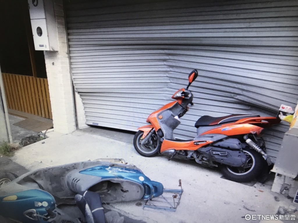 ▲2部機車撞擊受損嚴重,疑重大衝擊力撞毀店家鐵捲門。(圖/記者林悅翻攝)