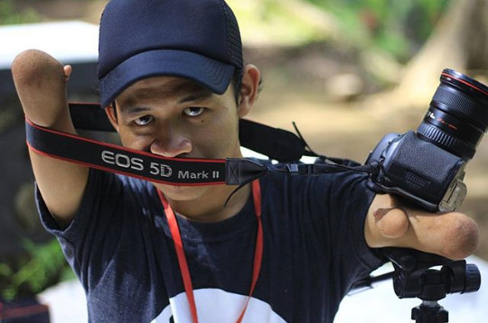 看到24歲的印尼攝影師祖卡奈因(Achmad Zulkarnain)所拍攝的照片,沒有人會相信他是個天生雙手只有上臂、雙腿僅剩數寸的人。儘管一出生身體就有殘缺,但他因熱愛攝影,用盡各種方式突破身體障礙,以彌補各個部位的不足,終成為一名知名且專業的攝影師,拍出一張張令人驚艷的作品。
