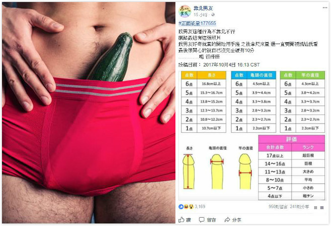 之前來自日本的「巨根測量圖」在網上流傳,不少男生開始動手測試,自己那一根的宏偉程度到哪。一名女網友就抱怨,男友發現這張圖後,興致勃勃的按步進行,還要開視訊給她欣賞;其他人看完po文也躍躍欲試,還互相留言嗆聲「拚輸贏」。