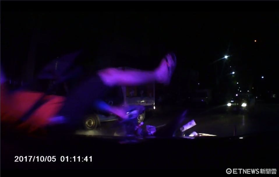 警方調查,38歲的黃男凌晨下班騎車欲從泰山返回五股住處,卻在新五、楓江路口闖紅燈,巡邏員警發現懷疑有異,亮警示燈要求受檢,不料黃男卻加速逃進新北產業園區內,巡邏員警立即啟動攔截圍捕機制,呼叫支援,黃男最終再五工六路躲避不及,高速撞上警車車頭,導致雙腳輕微擦傷,警車車牌也被撞掉,經送醫救治後並無大礙。