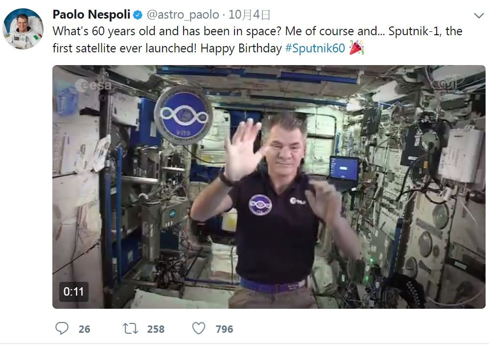 內斯波利在推特上發視頻說,「謝謝你,小小的但卻非凡的史普尼克!從你的第二個家——太空中祝你生日快樂。」並且還用義大利語、俄語和英語分別在推特上發文,「有誰已經60歲還曾經去過太空?一個是我,還有一個就是——史普尼克1號!」它是人類有史以來,第一顆發射的人造衛星。
