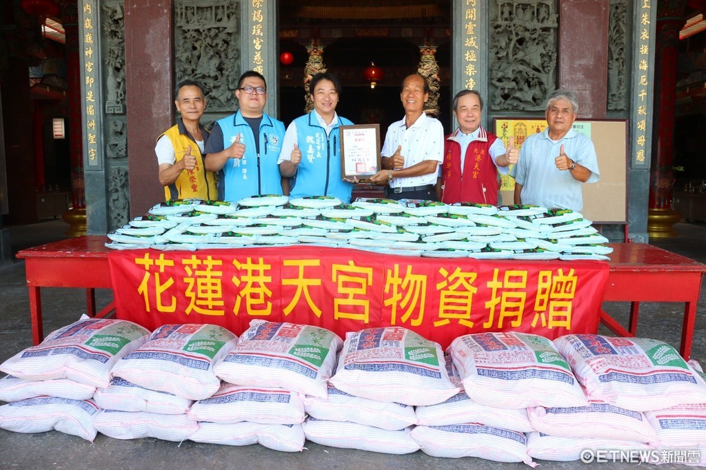 花蓮港天宮董事長賴榮文日前主持今年該宮的普度活動,他與董事謝富雄兩人自掏腰包購置普度白米,其中400包總重達1200公斤的白米轉贈給花蓮市各社福機構,魏嘉賢市長出席捐贈儀式感謝善舉,照顧更多花蓮市弱勢民眾,市公所社勞課也協助通知包含家扶中心、世界展望會、畢士大教養院等十個社福團體前來現場領取。