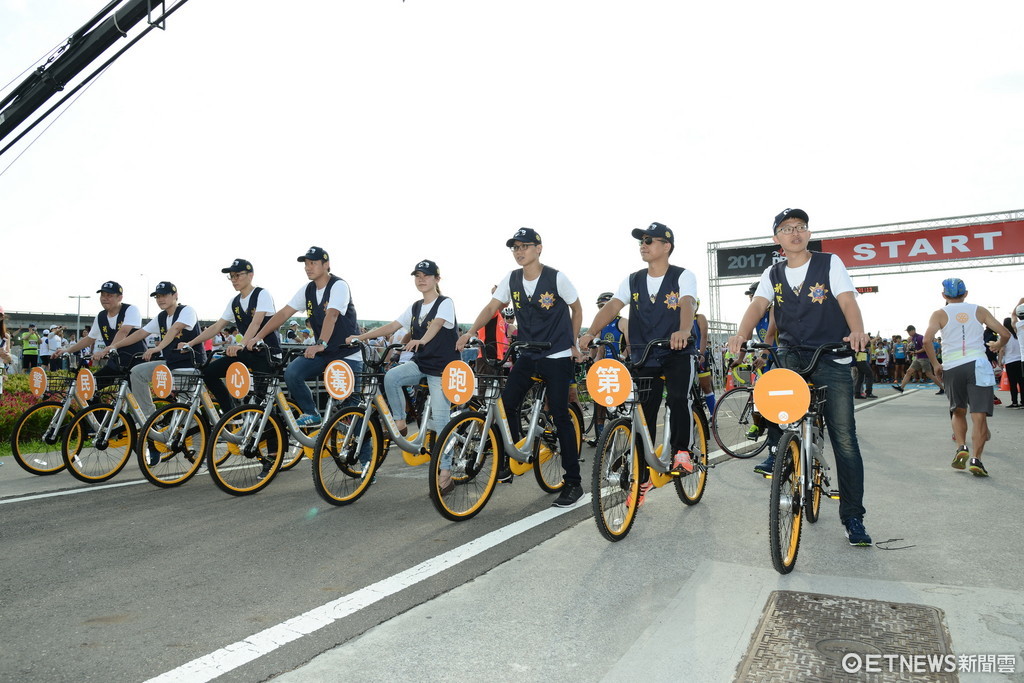 ▲8名刑事局的員警騎著Obike在前方為跑者導路。(圖/記者柳名耕翻攝)
