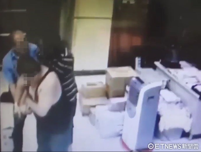 ▲鄧男(條紋上衣)持菜刀追討王姓保全(背心)2千元債務遭制止。(圖/記者陳豐德翻攝)