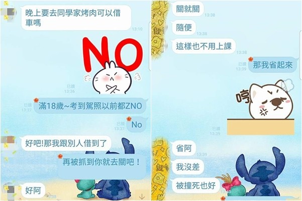 對話紀錄中,兒子先傳訊問「晚上要去同學家烤肉,可以借(機)車嗎?」媽媽堅定拒絕,「NO!滿18歲,考到駕照以前都NO!」但兒子仍是相當堅持,「好吧,那我跟別人借到了!」氣得媽媽直回「再被抓到(無照駕駛)你就去關吧!」