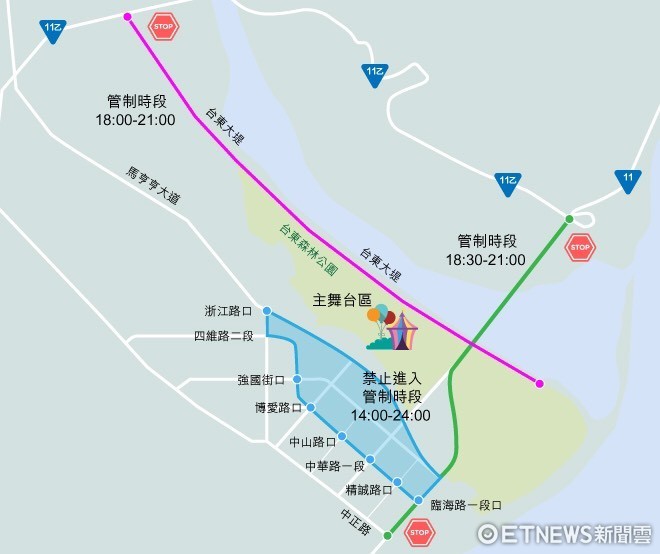 為讓施放順利,以及民眾能有最佳的欣賞環境與空間,縣府將實施交通管制,車輛管制區域為:北起省道台11線159K+850「與台11乙線岔口(含)」;南至四維路「中華路與四維路口以東路段(含),餘路段(不含)」;東至臨海路(含);西至浙江路(不含)之區域,自10月10日下午2時起實施,車輛均須受警察或義勇警察人員管制通行,除接駁車、持證及區域內住戶車輛外,餘均須改道通行。