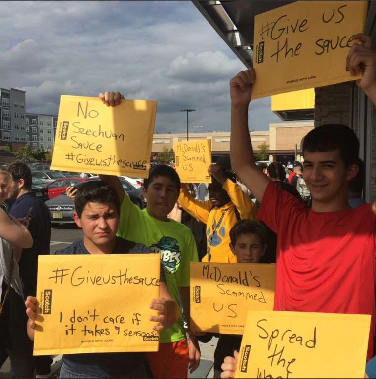 7日大批民眾為了「四川辣醬」聚集在美國各大麥當勞門口外排隊,但很快便被告知辣醬已經賣完,很多人相當不滿,便在門外大喊口號和高舉標語。網友在推特貼文中指出,「現場有超過1000人聚集,可是麥當勞只預備了70份蘸醬」,明顯低估了顧客需求。
