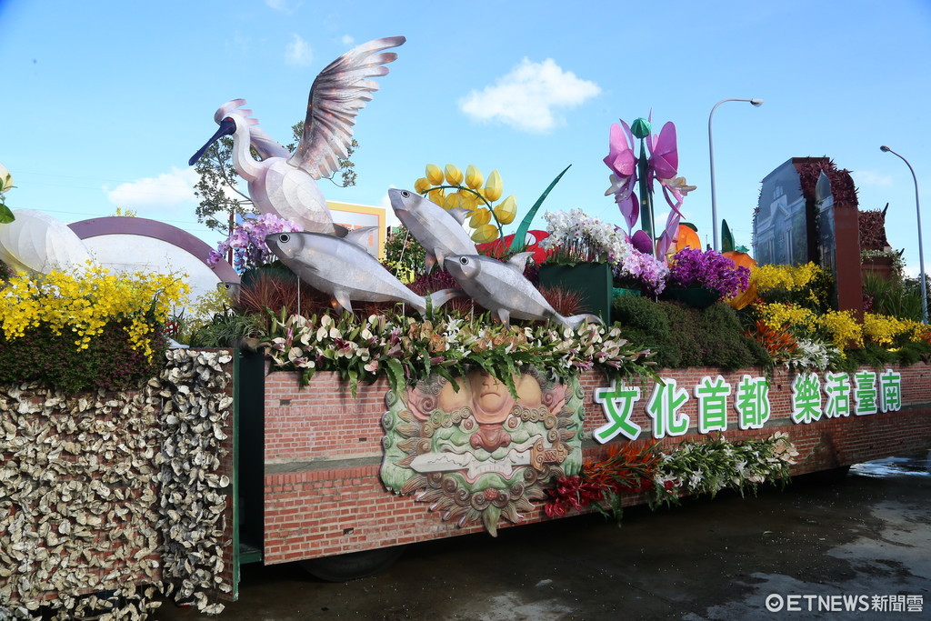 ▲台南市「文化首都、樂活台南」花車,車台前方以姿態優雅的黑面琵鷺起飛姿態象徵著台南市政的躍進。(圖/記者林悅翻攝)