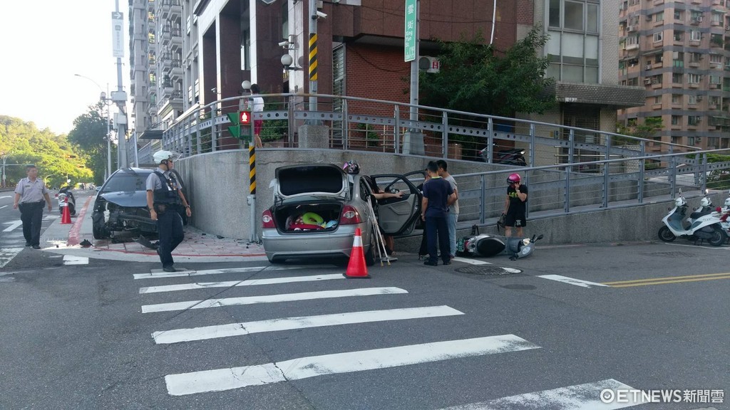 台北市內湖區的康寧派出所外,下午5點30分左右,「碰!」的一聲巨響,讓員警紛紛衝出來查看,結果卻讓人傻眼。一輛銀色轎車不偏不倚直撞上派出所的牆面,一旁一輛機車、一輛轎車也被波及。幸好車主、騎士共4人皆僅輕傷沒有大礙。