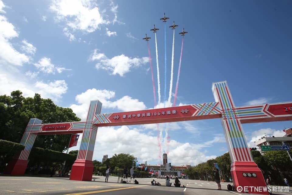 每年的「壓軸重頭戲」雷虎小組,今年則一改過去由北而南飛越觀禮台的路線,將由西向東,自總統府後方向前飛行,並劃下象徵青天白日滿地紅的藍、白、紅三道色彩,現場參與的僑胞與貴賓都相當捧場,現場歡呼聲不斷,將活動氣氛帶到最高潮。