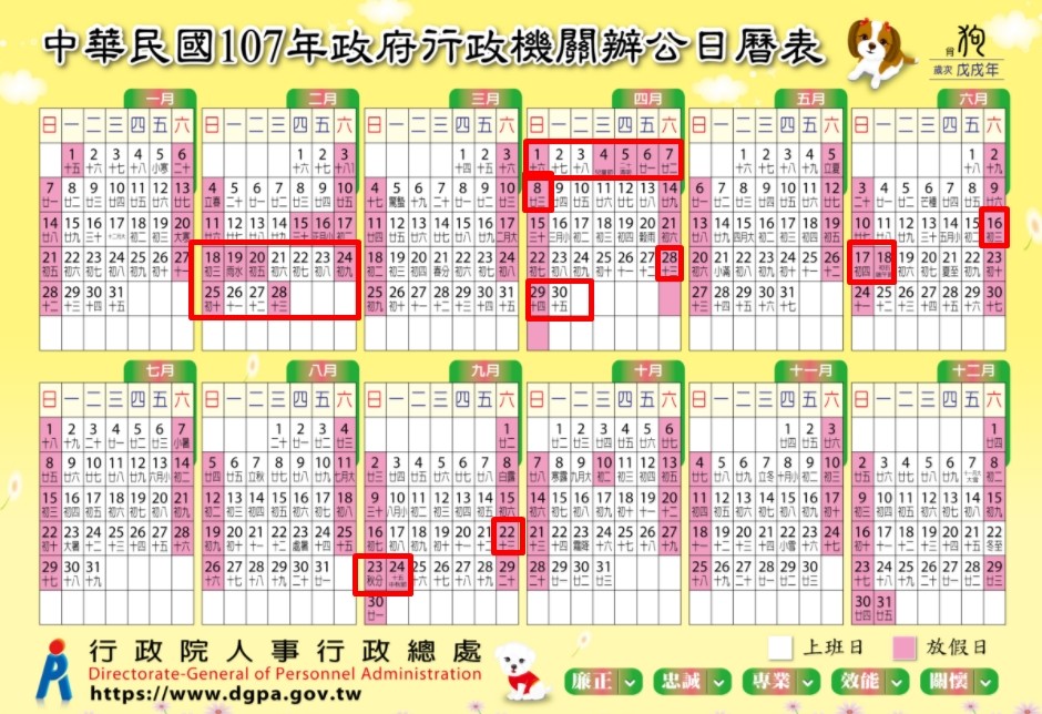 ▲107年辦公日曆表。(圖/行政院人事行政總處,下同)
