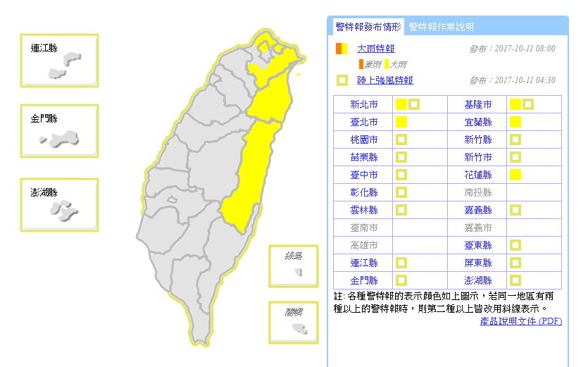 陸上強風特報縣市:新北市、基隆市、桃園市、新竹市、新竹縣、苗栗縣、台中市、彰化縣、雲林縣、嘉義縣、屏東縣、台東縣、澎湖縣、連江縣和金門縣。