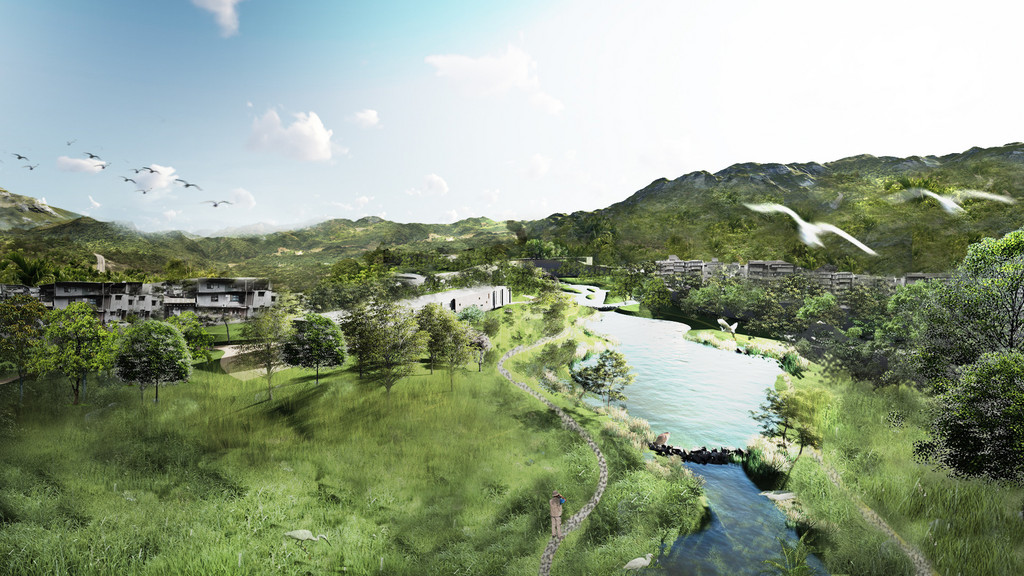 ▲台北市政府將永春陂打造成都會型溼地生態公園。圖為模擬示意圖,坡地植栽與開放水域段。(圖/台北市政府工務局大地工程處提供,下同)