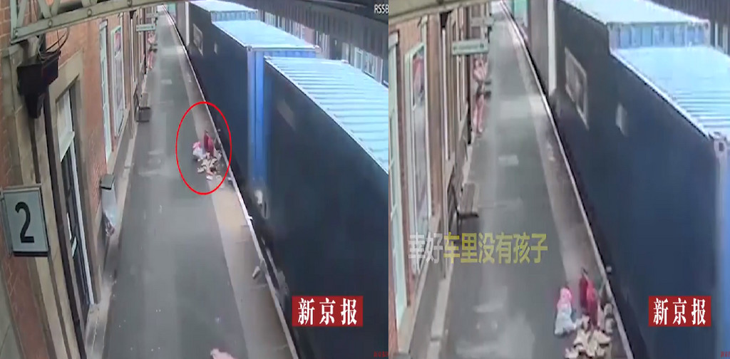 此監視器畫面是由英國納尼頌車站錄下,當時,一列載有多個貨櫃的火車行駛於鐵軌上,媽媽見狀,便將折疊嬰兒車裡的孩子抱起;沒想到掛滿東西的嬰兒車這時卻被揚起的風,「吸」了過去直接撞上急駛的列車,掉落月台,嬰兒車上的東西都壓碎,東西四散。