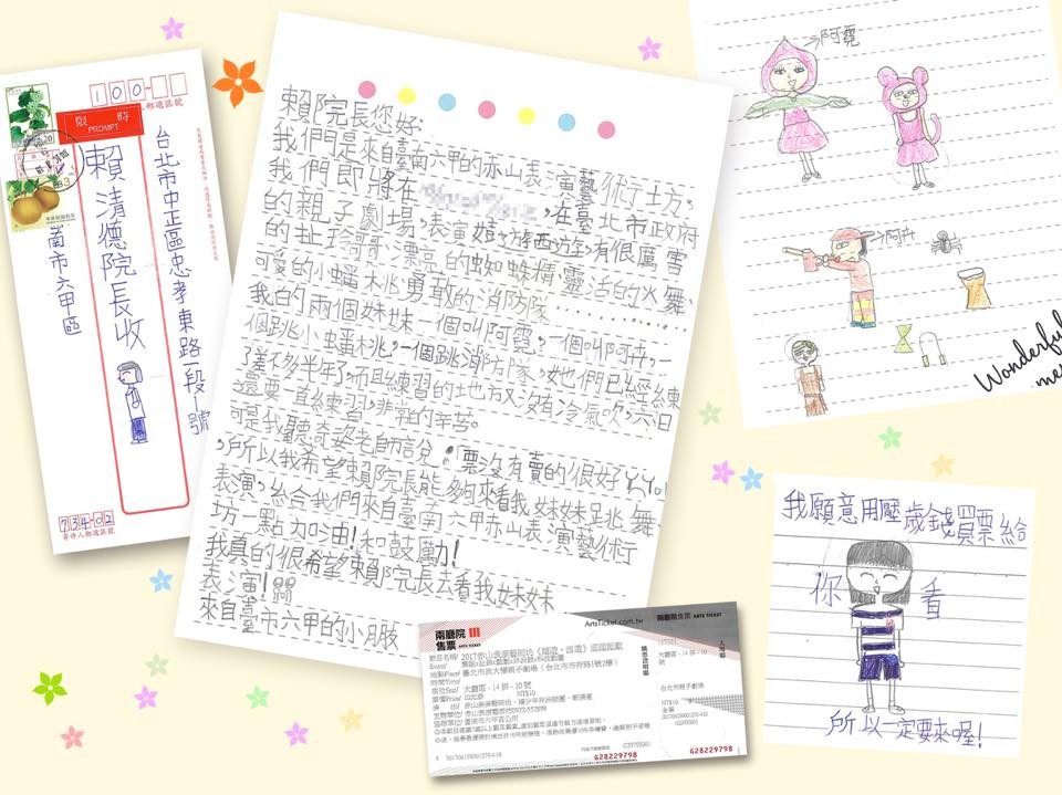 行政院長賴清德11日晚間在臉書PO出一封信,字跡顯得相當可愛。他隨後表示,這是台南市六甲區一名黃姓小朋友寫給他的,內容是邀請他去看台南六甲赤山表演藝術坊來台北演出的《嬉遊‧西遊》。他還說,這名小朋友用自己的壓歲錢買票給自己,相當有誠意又可愛,「我一定會到場觀賞。」