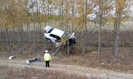 湖北省十堰市日前發生一起離奇的車禍意外,一輛白色小客車疑似速度控制不當,在樹林裡撞上樹木,車身被卡住懸掛在空中。當地公安局將照片PO上微博,調侃寫下:「這裡只有一片小樹林,你卻需要一個飛機場」,引發網友熱烈討論。