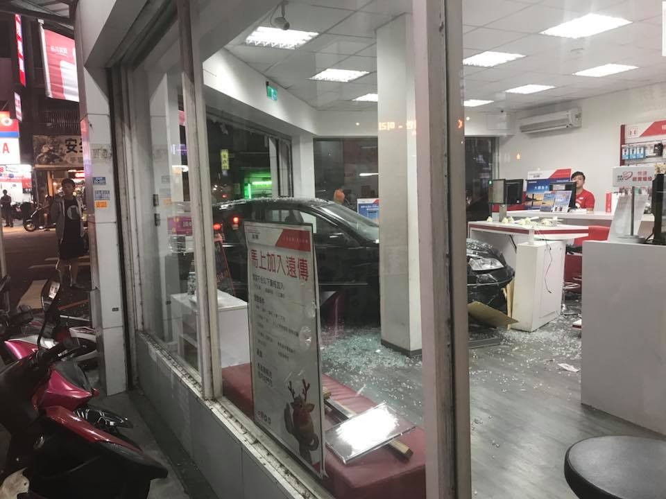 監視器畫面拍到,當時電信公司門市內,張姓男店員背對馬路,正在櫃台整理手機,一名女客人要走向玻璃門,下一刻黑色轎車朝著他衝來,突然就撞進店裡,玻璃門瞬間整片碎裂,男店員右腿被撞上,女客人則嚇到雙手抱頭往後跳、趕緊逃跑。
