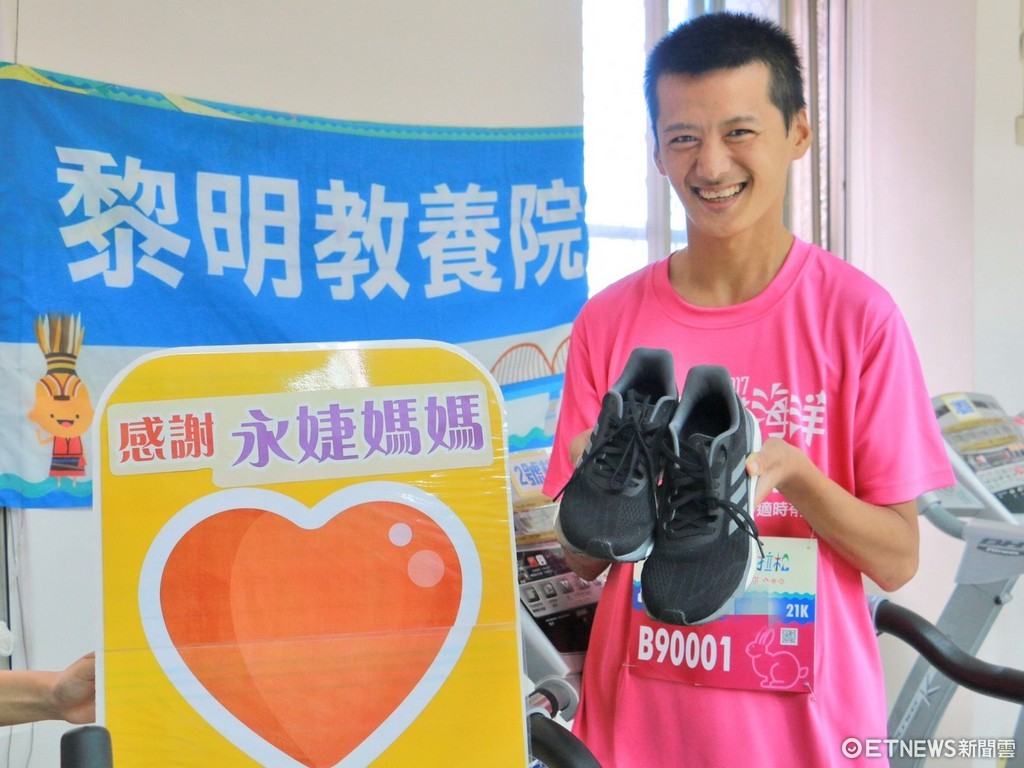 ▲熱愛運動的藝人賈永婕捐贈一筆經費,幫助花蓮黎明教養院的院生阿樺,擁有人生第一雙專業跑鞋,完成人生第一場21公里半馬。(圖/黎明教養院提供 下同)