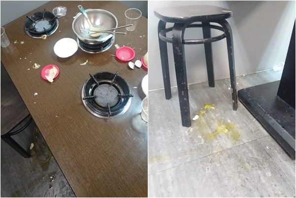 10月2日該名顧客又帶著孩子來用餐,離去後仍是杯盤狼藉,桌面、地上隨意棄置了數個被捏爛的塑膠杯,地上還有顆被砸破的生雞蛋。店長再也忍無可忍,氣得將對方列入黑名單,從此不再招待,「如果你再來,我就說『不好意思,本店不接客人了!』如果隔天還是來,我會直接說明,你已列入本店黑名單,原因就是你的孩子把我的餐桌、地上弄得跟戰爭一樣,而且每次來、每次都這樣!」