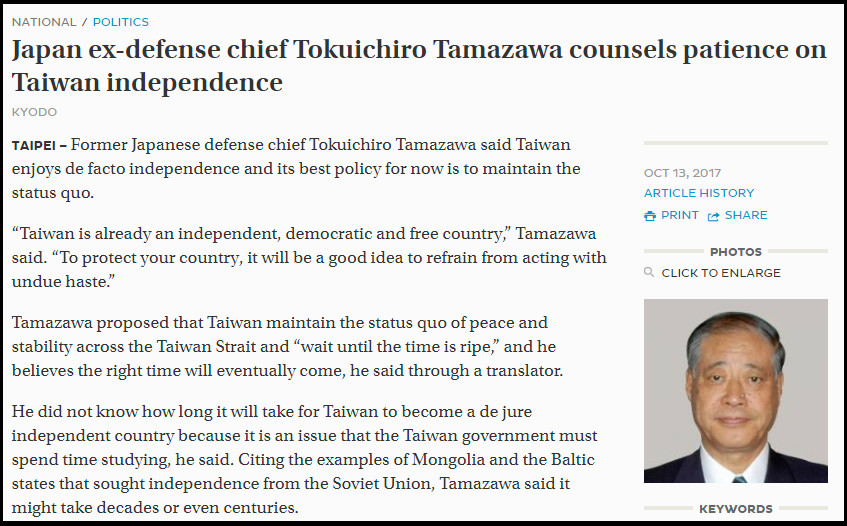 日本前防衛廳長官、農林水產大臣玉澤德一郎(玉沢徳一郎,音譯)12日在台灣接受日本媒體受訪時表示,「台灣實質上已經是獨立國家,但要宣布獨立還需要耐心等待,現在最好的作法就是保持現狀,不要操之過急」。