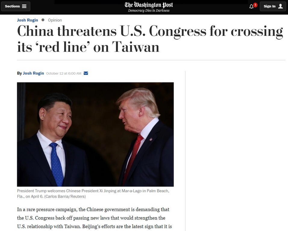 ▲《華盛頓郵報》:中國威脅美國國會議員,對台關係勿「跨紅線」。(圖/翻攝自華盛頓郵報)
