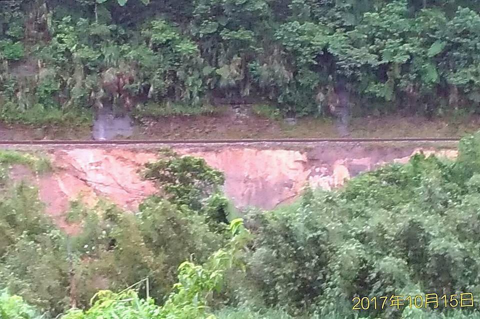 台鐵平溪線今(15)日清晨6時35分發現嶺腳至菁桐站間土石崩落、路基流失導致無法通行,由於現場路基不穩定搶修困難,台鐵宣布15日平溪線列車行駛至十分站止。