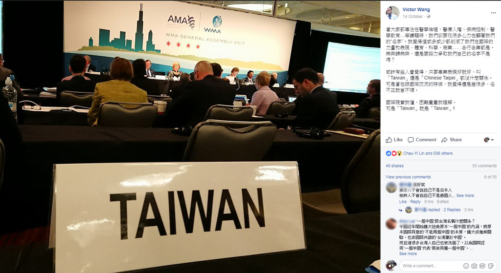 WMA世界醫師會年會日前在芝加哥舉行,代表台灣醫師會參加的醫師公會全聯會秘書長王必勝透露,中國醫師會再度提出要將我方更名為Chinese Taipei的提案,理由當然是「一個中國」政策,而且中國堅持,如果台灣醫師會不改名,就不同意WMA 2021年會在北京舉辦。不過,台灣醫師會仍堅持不改,並得到在場國際醫師們的鼓掌支持,然而因中國威脅,WMA秘書處希望雙方在未來幾個月「溝通一下」。