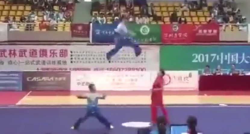 原來輕功水上飄是真的!中國大學生武術錦標賽於4日至7日在湖南舉行,有86所院校共672名運動員參加。其中3名選手在對練項目時激烈對打,更不時雙手做踏板,讓搭檔一躍超過兩個成人高度,全場觀眾不斷驚呼並鼓掌叫好,更有觀眾表示,「我快嚇尿了」。