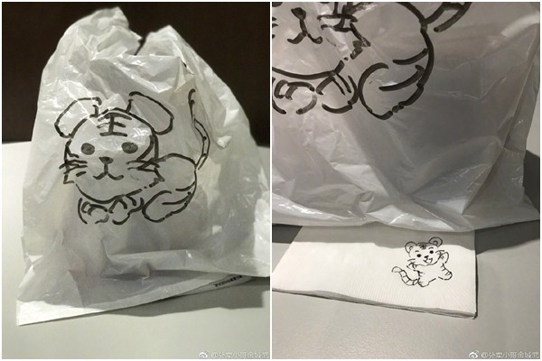 大陸知名博主「外賣小哥金城武」經常在微博上分享外送餐點時遇到的趣事,日前一名女子向他點餐,竟突發奇在單子上備註「失戀了,小哥可以幫我畫一隻小腦斧(老虎)嗎?」他雖然認為這個要求很奇怪,但為了滿足對方的心願,在能看到的地方都畫上了可愛的老虎插圖,希望能讓對方開心一些些。