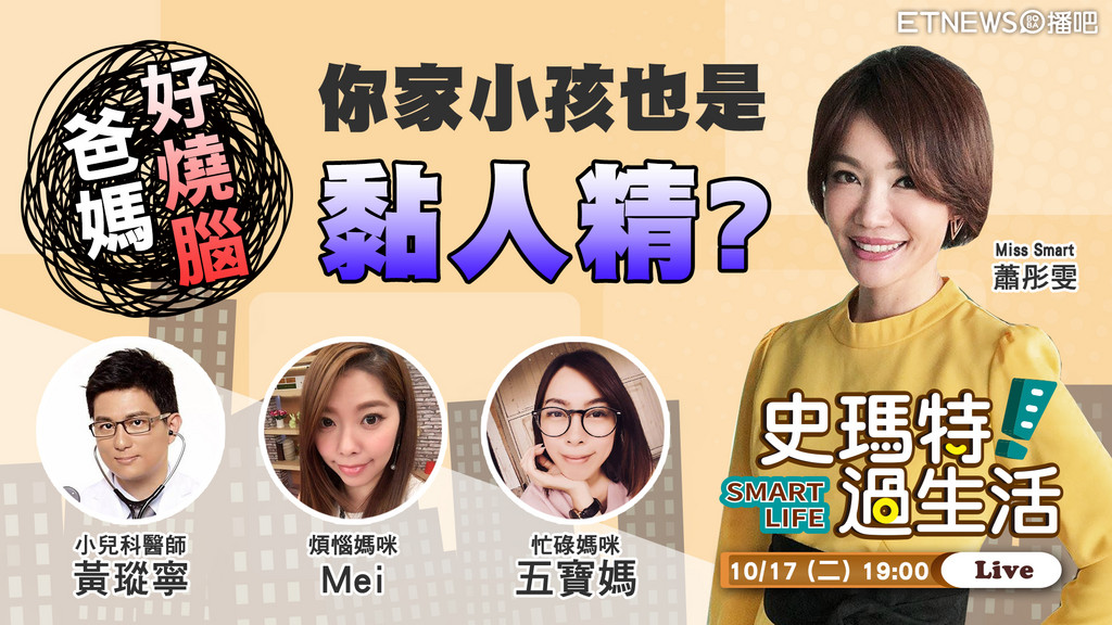 小孩準備要上學了!對爸媽來說喘了一口氣,但沒想到孩子竟然出現「分離焦慮」,只是去上個廁所也大哭大鬧「你不可以走!你不可以離開我!」就像個恐怖情人的情緒勒索。ETNEWS影音平台《播吧》17日晚上7~8點,就在直播節目《史瑪特過生活》請來小兒科黃瑽寧醫師,告訴大家怎麼辦!