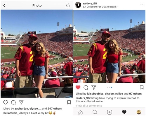 綜合外媒報導,伊莎貝拉(Isabella Koval)日前跟男友一起看球,兩人甜蜜合照並上傳Instagram,但沒想到同樣一張照片,她在圖說上甜蜜寫著「和男友一起狂歡囉」,但男友卻打上「坐在這裏試圖跟這隻沒文化的豬解釋足球比賽規則」等看似非常不耐煩的話。