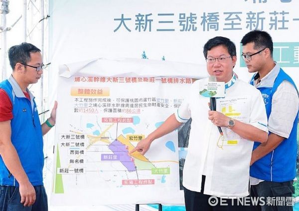 桃園市「埔心溪幹線大新三號橋至新莊一號橋排水路拓寬工程」、17日於蘆竹區舉行開工典禮。市長鄭文燦表示,為提高桃園國際機場防洪等級,要將1.2公里長的「埔心溪幹線大新三號橋至新莊一號橋排水路」河道再拓寬5公尺,108年5月完工後,同時保障蘆竹區新莊、大竹、宏竹各里居民生命財產安全。
