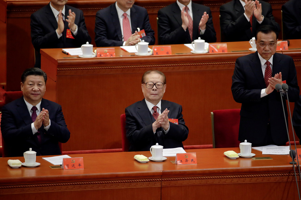 ▼十九大現場,習近平、江澤民等人。(圖/路透社)