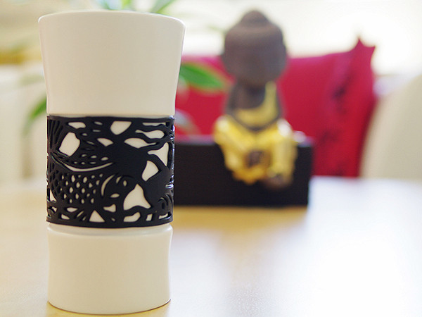 拿近一看,更佩服設計者細節處的用心規劃,想像到使用者飲茶時可能碰觸到的高溫情況,中間雕飾的魚形圖案特別採橡膠材質打造而成,無接縫的設計更不用擔心清洗時橡膠的脫落。