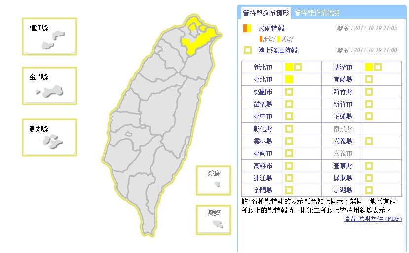 ▲中央氣象局19日晚間針對北北基發布大雨特報。(圖/中央氣象局)