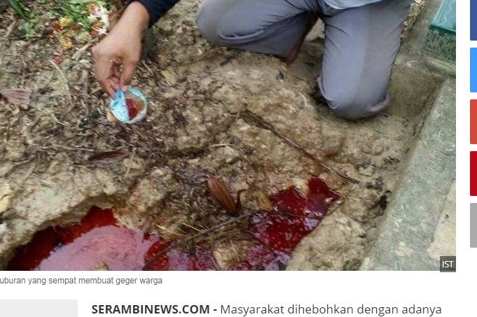 印尼東加里曼丹省(Kalimantan Timur)某伊斯蘭教墓地驚傳靈異事件!下葬20多天的墳墓泥土突然凹陷下沉,還不斷冒出血水出來,還帶有濃重的腥味,嚇得死者家屬趕緊帶土來填坑,才結束這場驚魂記。此畫面也被拍成影片在網路瘋傳,網友紛紛表示,「死者是想表達什麼冤屈嗎?」