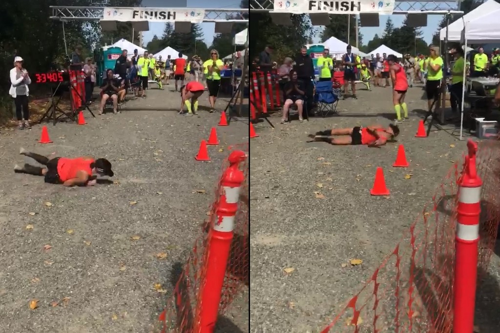 美國一名女子在8月參加華盛頓州北灣市(North Bend)的馬拉松比賽時,沒想到在終點前因為體力不支而跌倒,最後乾脆一路用滾的滾到終點,賽道兩旁的觀眾都在為她鼓掌加油,最後終於完成比賽。而她不放棄的身影也被其他選手錄下來PO網,激勵了許多網友。